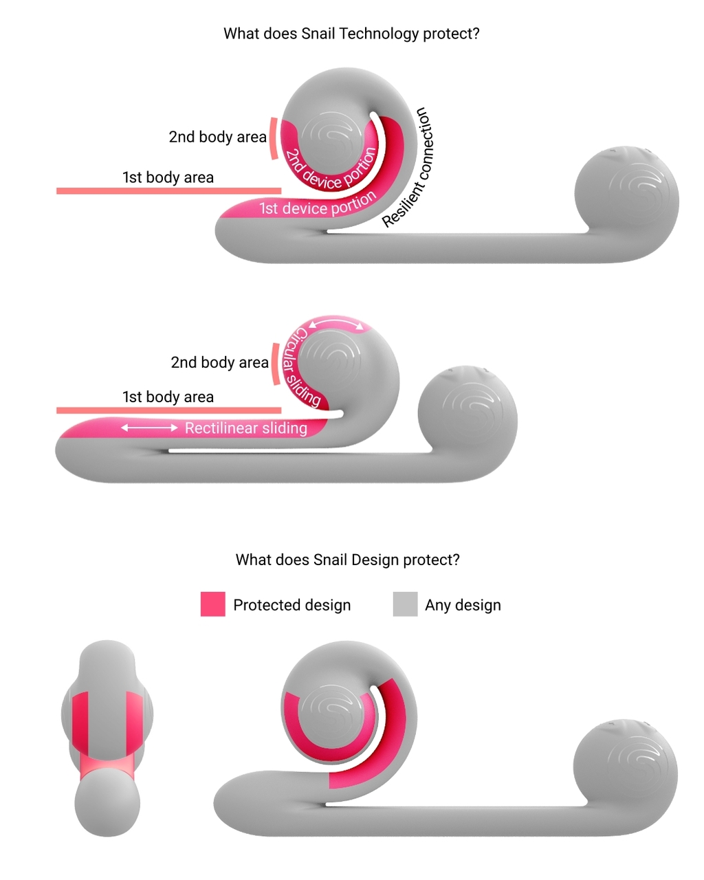 Snail Vibe patents protect both the design in whole or in part, and the technical solution. In general, the Snail Technology is understood as the movement of two smooth or ribbed surfaces of the device relative to two areas of the male or female body. Futhermore, the first surface performs a rotational slide, and the second surface performs a translational slide. And these movements are interconnected by the resilient element, which also provides a return sliding. Dependent patents of third parties, in which the Snail Vibe technology or design is fully or partially used, cannot be used without our permission. Additionally, the appearance is protected by copyright that does not require registration and prohibits full or partial use of the original design.