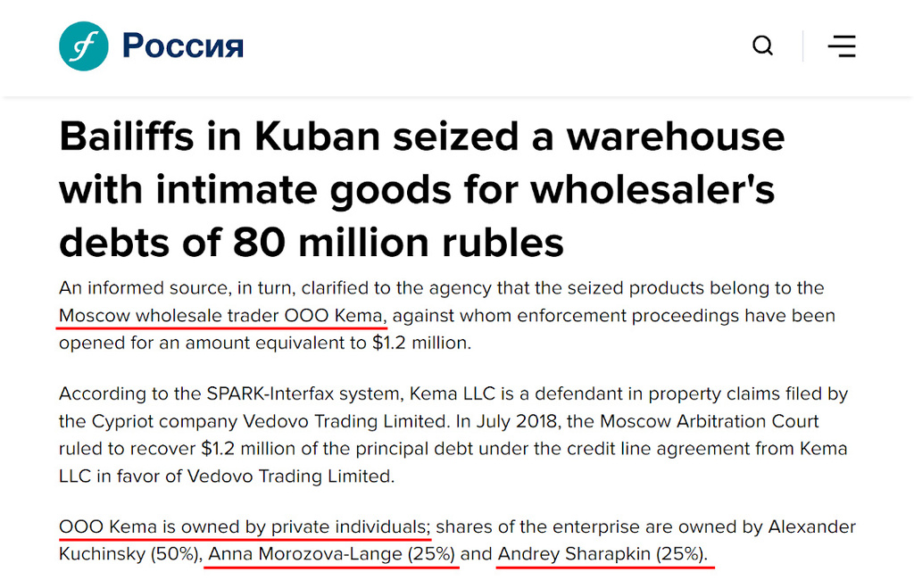 Article about the seizure of Kema's warehouse of intimate products https://www.interfax-russia.ru/south-and-north-caucasus/news/pristavy-na-kubani-arestovali-sklad-s-intim-tovarami-za-dolgi-optovika-v-80-mln-rubley