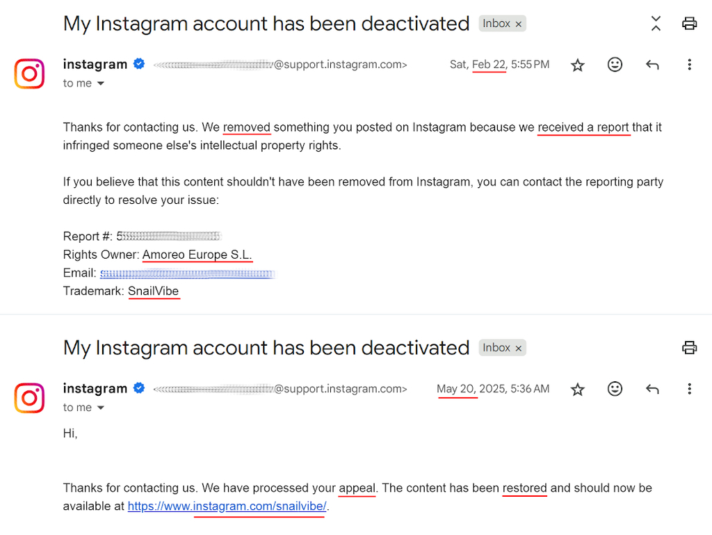 Emails about Amoreo's complaint and IG account @snailvibe restoration