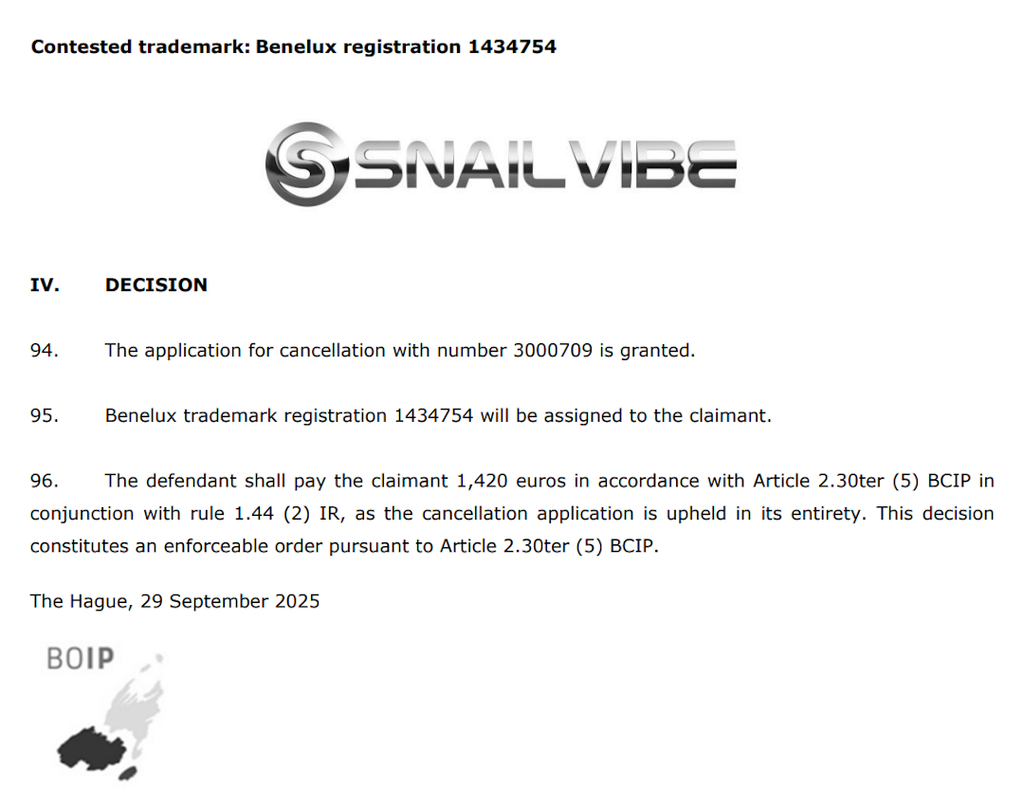 Official decision to cancel Amoreo's trademark https://www.boip.int/system/files/publication/tmcpd/3000709_SNAIL%20VIBE_Bad_Faith%20%2B%20unauthorised%20filing_TVH_EN.pdf