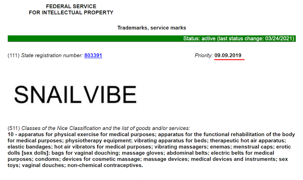 Trademark 'snailvibe' No. 955644 https://fips.ru/ofpstorage/Doc/TM/RUNWTM/000/000/095/560/400/%D0%A2%D0%97-955604-00001/document.pdf