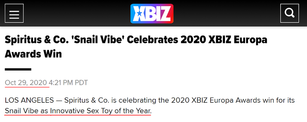 Article on the XBIZ site https://www.xbiz.com/news/255334/spiritus-co-snail-vibe-celebrates-2020-xbiz-europa-awards-win