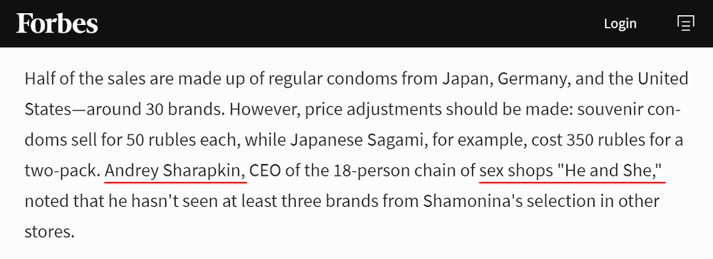 Interview with Andrey Sharapkin, CEO of the "He and She" chain of stores https://www.forbes.ru/svoi-biznes/istorii-uspekha/251948-veselyi-intim-kak-zarabotat-na-torgovle-prezervativami