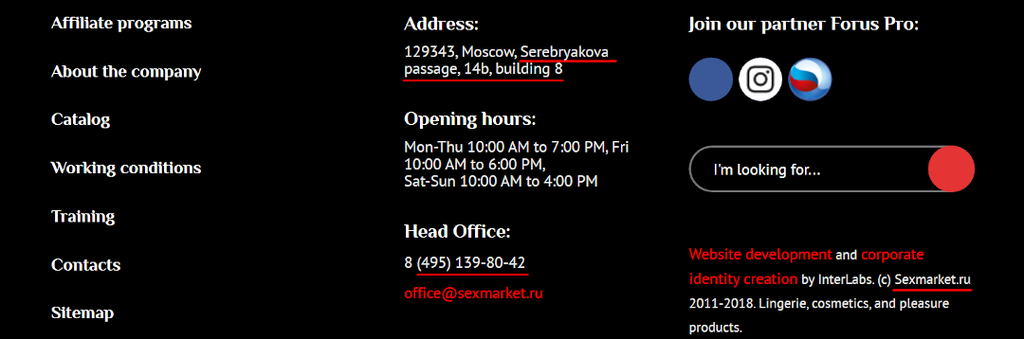 and screenshot of S-Market's website with same phone number and address https://web.archive.org/web/20190826055409/https://www.sexmarket.ru/